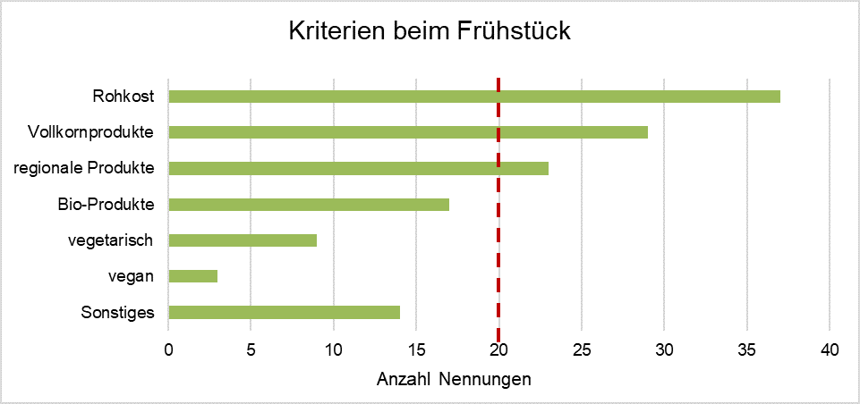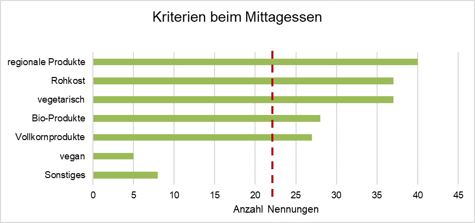 Die Umfrage zeigt, dass bereits ein breites Bewusstsein für das Thema gesunde Ernährung besteht. Der überwiegende Anteil der teilnehmenden KiTasberücksichtigt bereits Kriterien der gesunden und nachhaltigen Ernährung wie Rohkost, vegetarische Ernährung oder Biokost.