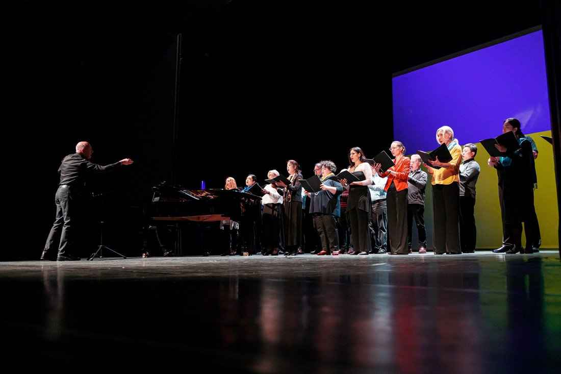 Anrührend war gleich der Beginn: Der Opernchor trug begleitet von einem Bläserquartett die ukrainische Nationalhymne vor, zu der das Publikum geschlossen aufstand. Es folgten Arien von Musiktheater-Solist*innen, die am Klavier begleitet wurden, kammermusikalische Beiträge von Orchester-Mitgliedern sowie weitere Chorwerke, bei denen Chorsänger*innen auch solistisch brillierten. Darüber hinaus sorgten Mitglieder des Schauspielensembles für die leisen, nachdenklichen Töne mit Gedichten und Liedern für den Frieden und gegen den Krieg. Den Schluss bildete das „Gebet für die Ukraine” des ukrainischen Komponisten Mykola Lyssenko, das von einem Blechbläser-Ensemble vorgetragen wurde.