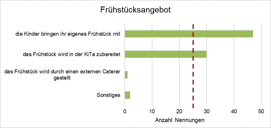 Die Umfrage zeigt, dass bereits ein breites Bewusstsein für das Thema gesunde Ernährung besteht. Der überwiegende Anteil der teilnehmenden KiTasberücksichtigt bereits Kriterien der gesunden und nachhaltigen Ernährung wie Rohkost, vegetarische Ernährung oder Biokost.