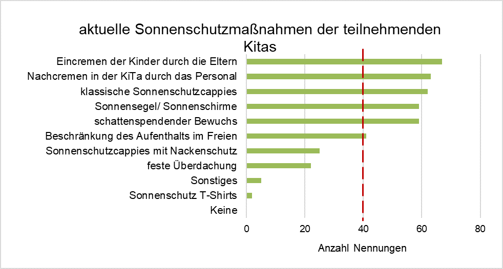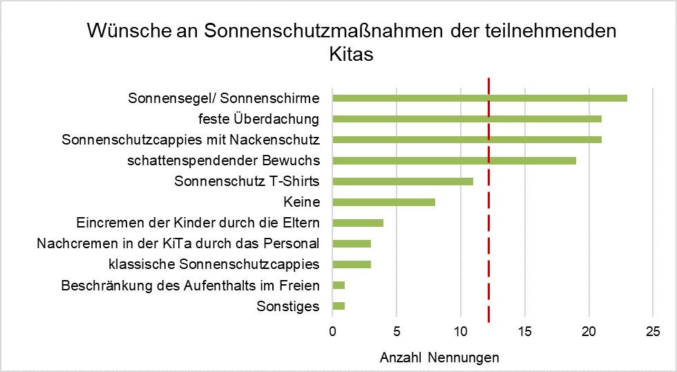 Die Umfrageergebnisse zeigen, dass sowohl die Notwendigkeit, als auch der Wunsch nach einer Verbesserung des UV-Schutzes in den KiTas vorhanden sind.