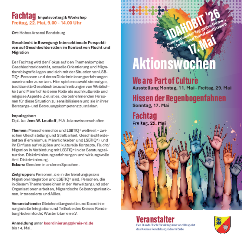 Der Runde Tisch für Akzeptanz und Respekt (RuTi) besteht seit 2016. Er setzt sich aus Mitgliedern der Zivilgesellschaft und der Politik zusammen und wird geschäftsführend geleitet von der Gleichstellungsbeauftragten des Kreises Rendsburg-Eckernförde. Der RuTi wurde durch den Kreistag mit einem jährlichen Budget von 10.000 € ausgestattet. Grundsätzliches Ziel ist es, Maßnahmen zur Sensibilisierung für geschlechtliche Vielfalt/sexuelle Orientierung zu entwickeln und umzusetzen sowie den Abbau von Vorurteilen und die Akzeptanz von Vielfalt zu unterstützen. Engagierte Personen und Organisationen/Vereine können für eigene Vielfaltsarbeit Zuschüsse beantragen