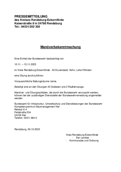 Drei Manöverbekanntmachungen (zwischen dem 21.10. - 13.11.2025 im Kreisgebiet)