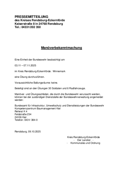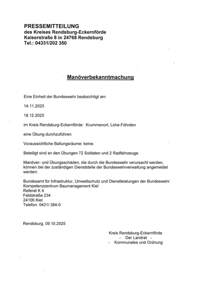 Zwei Manöverbekanntmachungen (zwischen dem 03.11. - 18.12.2025 im Kreisgebiet). Mehr Informationen entnehmen Sie bitte den nebenstehenden PDF-Dokumenten.